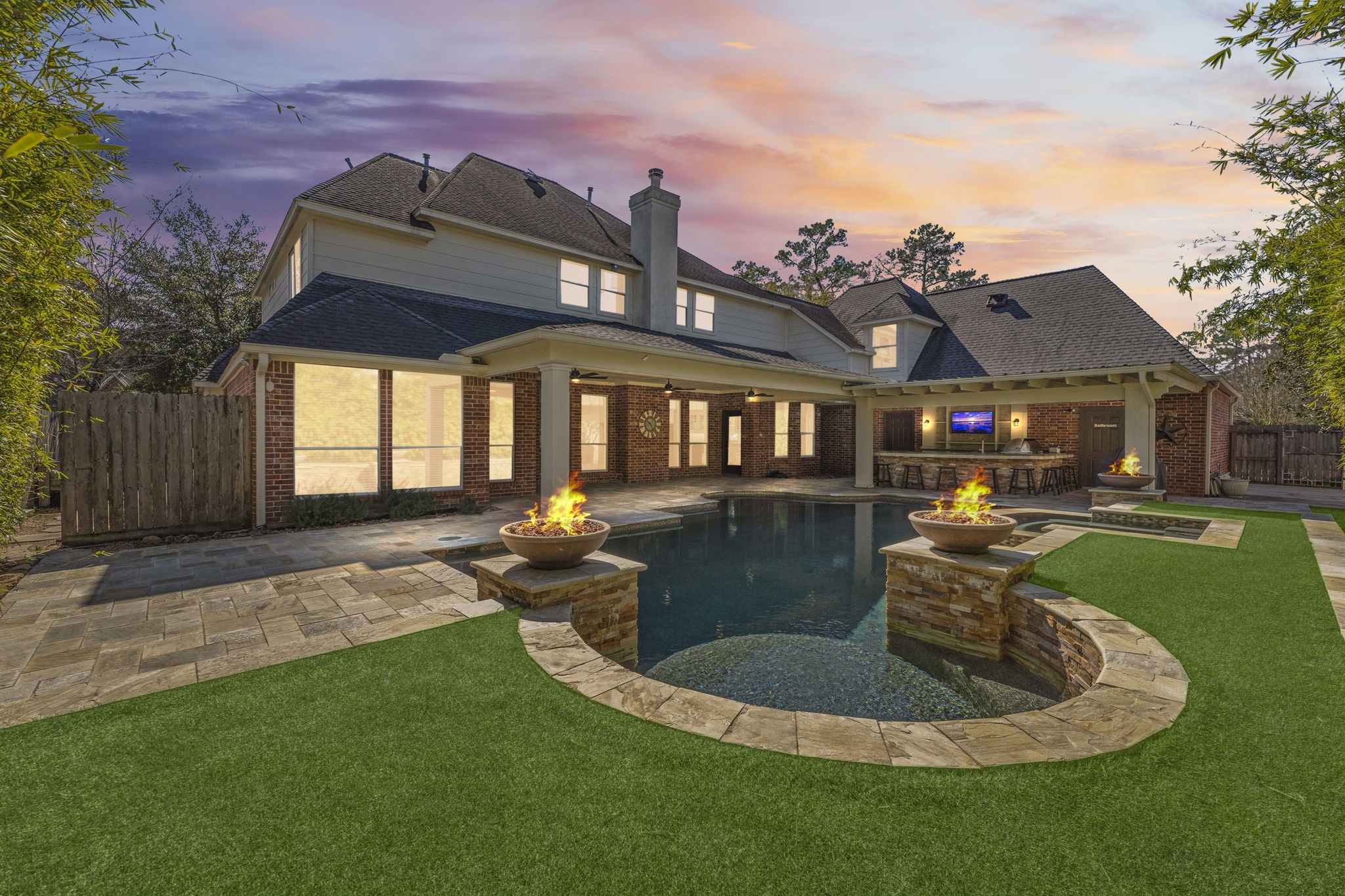 - Exterior Features: Covered Patio, Fully Fenced, Spa/Hot Tub, Sprinkler Irrigation, Outdoor Kitchen, Patio, Private Yard, Tennis Courts