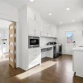 My open-concept chef’s kitchen includes quartz countertops, a five-burner Bosch range with pot filler, two sinks and an under-counter microwave oven. This is complemented by a separate scullery/laundry room in the back where you have easy access to extra storage, a utility sink, a second microwave, and ample counter space – perfect for hiding prep and cleanup when entertaining. And entertaining here is easy: there’s a dining area that can accommodate up to 8 and room at the peninsula for another 3, as well as plenty of space for a temporary “kids table” or two.