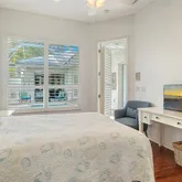 The primary suite is a true retreat, featuring a generous layout, a spa-like bath with double vanities, soaking tub, walk-in shower, and a large walk-in closet with natural light and tranquil golf course views. A versatile third bedroom—currently styled as an office—offers direct access to the courtyard, enhancing the home’s seamless flow.