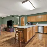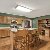 - Kitchen Features: Cabinets Stain, Kitchen Island, Solid Surface Counters, View to Family Room