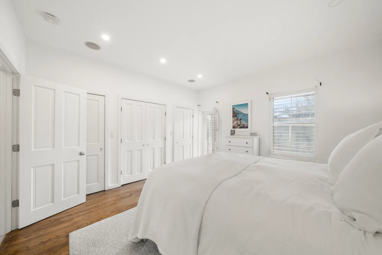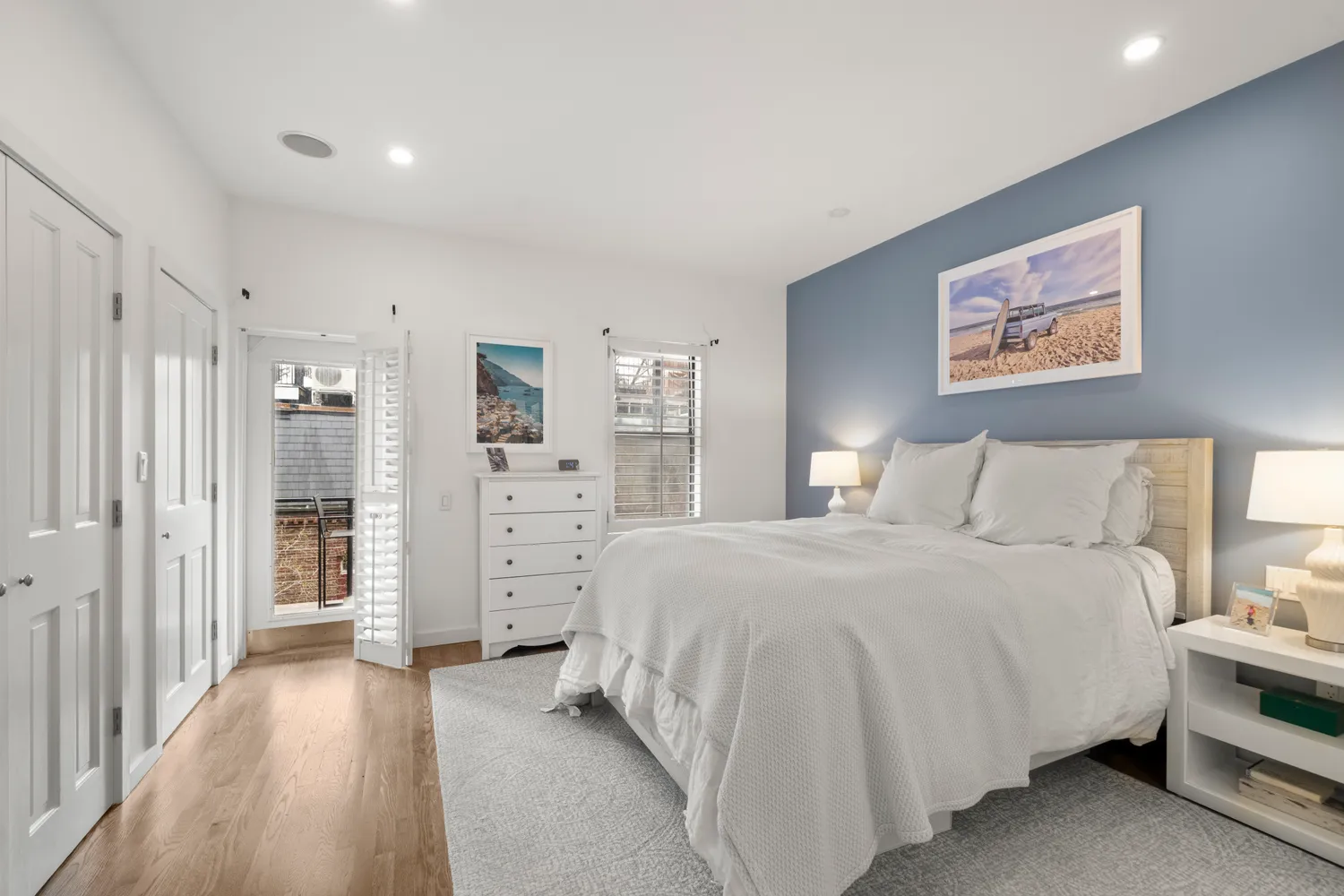 Upon entry on the second level, a beautifully appointed and highly adaptable room welcomes you, lined with bespoke cabinetry and ideal as a home office, gym with a stylish mudroom, or third bedroom. A well-placed renovated half bath completes this level.