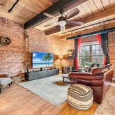 - Room Living Room Features: Ceiling Fan(s),Beamed Ceilings,Flooring - Laminate,Open Floorplan,Lighting - Overhead