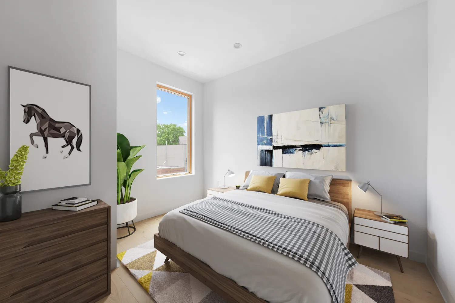 A coat closet and powder room welcome you into the foyer of your castle in the sky. The kitchen is bathed in sunlight, featuring an in-wall oven & microwave, five-burner stove, wine fridge, and of course a dishwasher and French door refrigerator. Past an elegant and modern floating staircase with a spacious nook underneath, the living room opens up to a beautiful balcony that faces due North. The laundry room is located on this level as well.