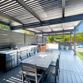 - Exterior Features: Bar, Storage, Sprinkler System, Shed, Privacy Wall/Fence, Outdoor Shower, Outdoor Kitchen, Lanai, Lighting, Rain Gutters, Fruit Tree(s), Fencing, Built-in Grill