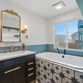 - Room Description: Spa-like luxury ensuite bath with stylish tile flooring, subway tile backsplash, a single vanity with modern fixtures, a gorgeous built-in soaking tub under a window, plus a frameless glass walk-in shower with a rain shower and wall wand