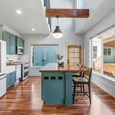 - Room Description: The back house features a gorgeous modern kitchen with a large center island illuminated by a pendant light, finished butcher block countertops, contemporary cabinetry, and subway tile backsplash; Premium appliances include a fridge, dishwasher, electric range with double oven (convection), wine fridge, and microwave; Exposed beam and towering vaulted ceiling open to the second floor above; Wood-look laminate flooring