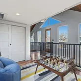 Completed in 2021, the detached rear home adds striking architectural contrast. The main level features a sleek modern kitchen, living area framed by picture windows, one bedroom, and a full spa-inspired bath. Upstairs, vaulted wood-wrapped ceilings and iron railings define a dramatic second living space overlooking the main floor below, while a ladder-access loft creates a tucked-away retreat. Per tax records, front house is 1,361 sq ft, back house is 908 sq ft.