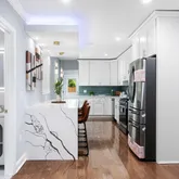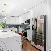 The kitchen has been meticulously designed with contemporary finishes, featuring high-end stainless steel appliances, sleek cabinetry, and elegant countertops that create a perfect space for culinary creativity. The open layout seamlessly connects the kitchen to the living and dining areas, making it ideal for both entertaining and everyday living.