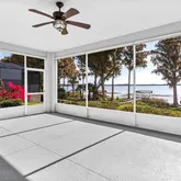 appliances, solid wood cabinets, breakfast bar, and two pantries, while the breakfast nook offers more sweeping lake views. The Primary Suite is a private retreat with spectacular waterfront views, slider to the lanai, two walk-in closets, and spa-style bath with double vanity, soaking tub, large walk-in shower, and
