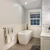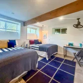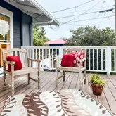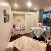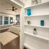 The peaceful primary suite offers a serene view of mature bamboo foliage, a dramatic custom accent wall & double French door closet w/built-in organizers & on demand lighting. A modern main bathroom showcases a standalone fiberglass soaking tub, a floor-to-ceiling tile rainfall shower & a new vanity. Additionally, there is a charming front bedroom, currently serving as a nursery, which includes built-in seating w/storage.