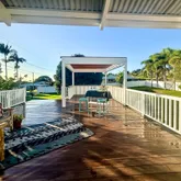The exterior of the property includes a 4 vehicle carport w/additional storage space and a fully fenced 15,987 sq ft level backyard with walk-down deck and sits on a