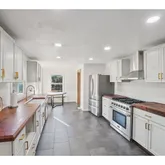 - Kitchen Appliances: Dishwasher, Free Standing Gas Range, Free Standing Refrigerator, Gas Appliances, Range Hood, Solid Surface Countertop, Stainless Steel Appliance, Tile