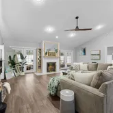 - Interior Features: Ceiling Fan(s), Crown Molding, High Ceilings, Kitchen/Family Room Combo, Living Room/Dining Room Combo, Open Floorplan, Pest Guard System, Primary Bedroom Main Floor, Solid Surface Counters, Solid Wood Cabinets, Split Bedroom, Stone Counters, Thermostat, Vaulted Ceiling(s), Walk-In Closet(s), Window Treatments