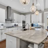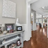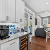 Inside, this spacious and thoughtfully designed floorplan features 4 bedrooms, including a generous guest bedroom on the first floor, plus a large bunk/loft space currently styled as a sitting room. The living room is warm and inviting with solid pine floors, white beam accents, and a cozy new fireplace with tile surround. The updated kitchen is both beautiful and functional, offering white shaker-style cabinetry, new quartz countertops, updated backsplash, granite surfaces, and upgraded appliances including an Advantium microwave, gas cooktop, and wine fridge.