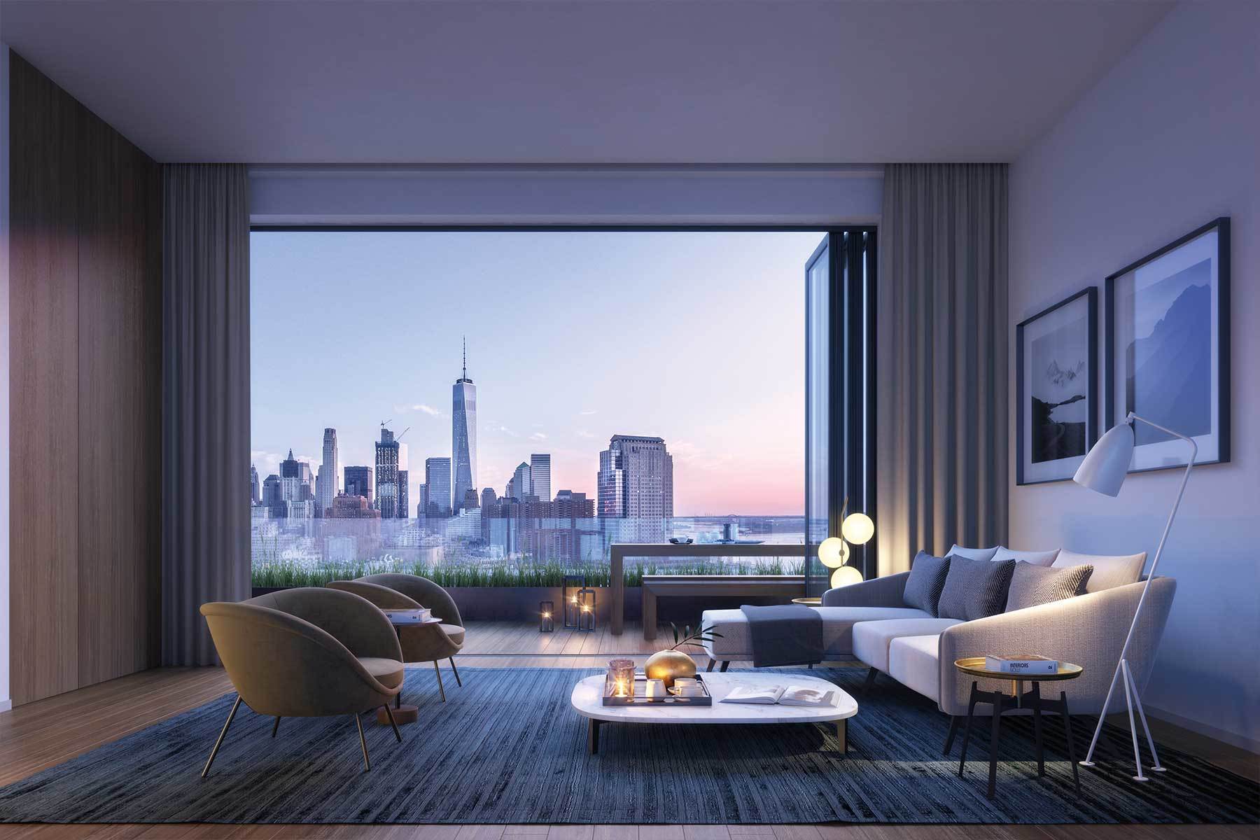 PHA is a full floor residence on the 24th floor overlooking beautiful and iconic visual treasures from every window. Sweeping cinematic views grace every room, from the Hudson River, south to One World Trade and all points north with the Empire State Building a glowing beacon at night. Enter the home via the key-lock elevator to a private entry gallery leading to the beautiful Great Room, featuring a south-facing terrace accessible via a Schuco folding glass wall system connecting the living room to the outdoors. With ceilings nearly 11 feet tall, the immediate dramatic effect of this 3 bedroom, 3 bath 1,943 SF home is wonderful for entertaining.