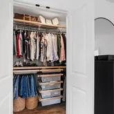 Second level includes two bedrooms, including a primary suite featuring His and Hers closets with closet systems and a dual-vanity bath. Laundry area is conveniently located on the bedroom level. Third level offers a private bedroom suite or bonus room with walk-in closet and full bath, ideal for guest space, home office, or media/flex use.