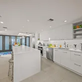 The interior has been thoughtfully and completely remodeled to reflect today’s most sought-after contemporary coastal aesthetic. Sleek Durastone porcelain tile flooring, solid core doors, plantation shutters, and crisp architectural lines create a polished, sophisticated atmosphere throughout. The chef-inspired kitchen is both stylish and functional, featuring white cabinetry, quartz countertops, built-in GE Monogram stainless appliances, recessed lighting, and statement pendants illuminating an oversized island with seating—perfect for entertaining against a backdrop of turquoise Gulf waters.