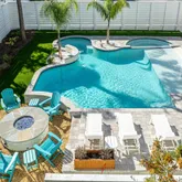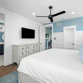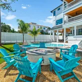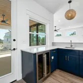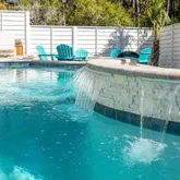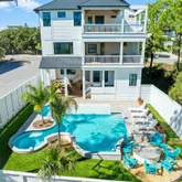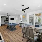 The covered porch on the main level provides a serene view of the resort-inspired pool, complete with a built-in grill extending from the kitchen. The second level features 2nd bedroom with private bathroom and porch. As well as a 3rd bedroom with private bathroom and a connected hallway with bunks. This floor also includes a secondary living area with a game room, media room, half bathroom, beverage station, and a large covered porch overlooking the pool.