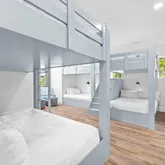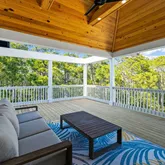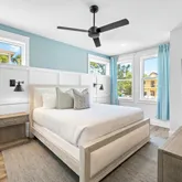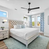 On the third level, you'll find two additional bedrooms with king-size beds and en-suite bathrooms, along with a spacious bunk room connecting to two full bathrooms. A sitting area, video game console, beverage station, and another expansive outdoor porch offers views of the lush Seagrove landscape.