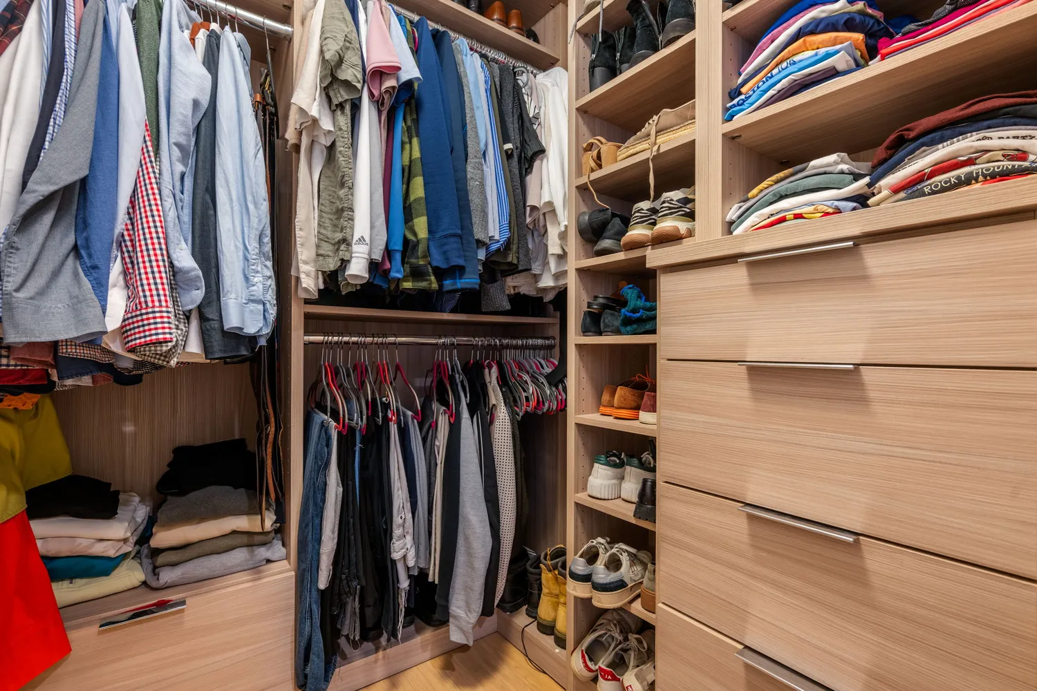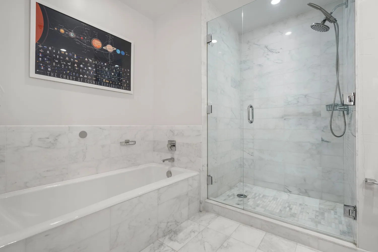 The primary suite features two closets, including a generous California walk-in closet, and a spa-like marble bath with soaking tub and glass-enclosed shower. A well-proportioned second bedroom is paired with a full second bath, offering excellent flexibility for guests or a home office. In-unit laundry adds everyday convenience.