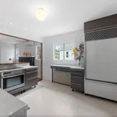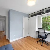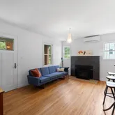 Inside, you’ll find refinished hardwood floors and a sleek, open kitchen with a breakfast bar, Miele cooktop and oven, Subzero fridge, Eggersmann cabinetry, and a stunning Italian glass tile backsplash. Track and recessed lighting add warmth and style, while dual-pane windows keep things energy-efficient.