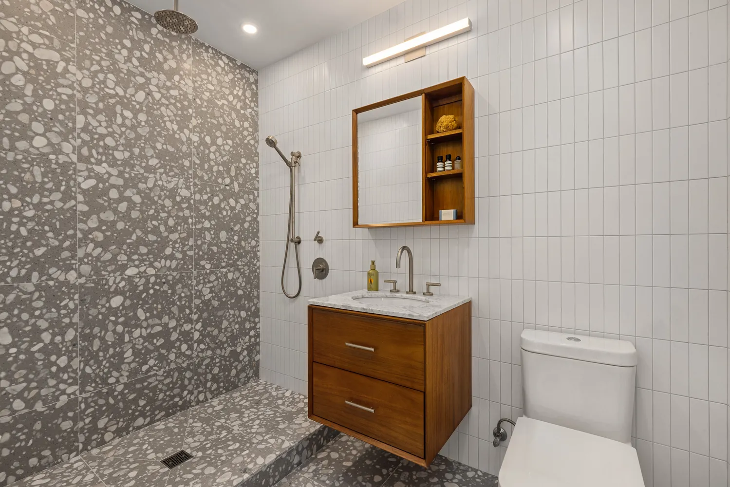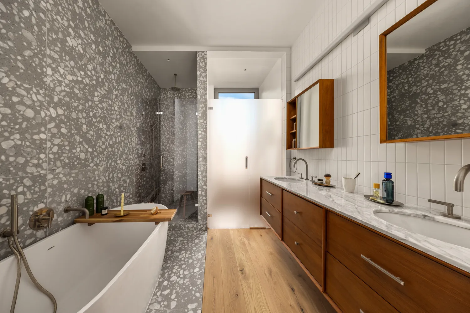 The home’s luxurious accommodations begin with a serene main-floor primary suite featuring a king-size layout, peaceful garden views and a generous walk-in closet. In the gorgeous en suite bathroom, discover a 59-inch freestanding soaking tub, a rain shower with a hand sprayer, a private water closet with a Duravit commode, a wide double vanity by West Elm, and two large medicine cabinets all surrounded by large-format terrazzo tile and upscale Phylrich fixtures.