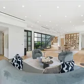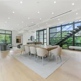 The chef’s kitchen is both striking and functional, featuring premium appliances, custom millwork, generous prep space, and a temperature-controlled wine display, all opening effortlessly to the main living and dining areas—ideal for entertaining at scale or intimate gatherings. Elevator access serves both levels for added convenience.