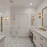 Inside, walls of windows flood each space with natural light, showcasing the home’s graceful proportions and thoughtful design. The second level is dedicated entirely to the primary suite—a private retreat offering serene views, dual master closets, and a custom-designed dressing room that feels more like a boutique than a closet. The ensuite bath is a study in luxury, with separate vanities, fine finishes, and an abundance of storage.