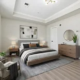 The spacious primary suite features a walk-in closet with a custom system, a private soaking tub, and elegant finishing touches. Custom TV racks and media furnishings are present in both the living room and primary bedroom, along with select window treatments.