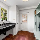 The main level also includes a gracious formal living room with a second fireplace, elegant dining room, powder room, and a functional mudroom with garden sink and custom cubbies.