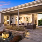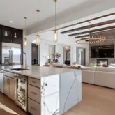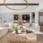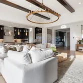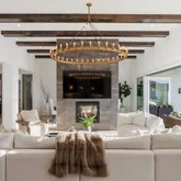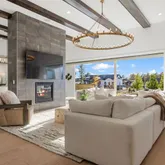 - Room Description: 12 Foot Beamed Ceilings, RH Light Fixture, Custom Double Sided Gas Fireplace, 24 Foot Sliding Doors Open to the Expansive Outdoor Patio, Surround Sound