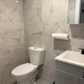 - Modern full bathroom with rainfall shower and deep soaking tub