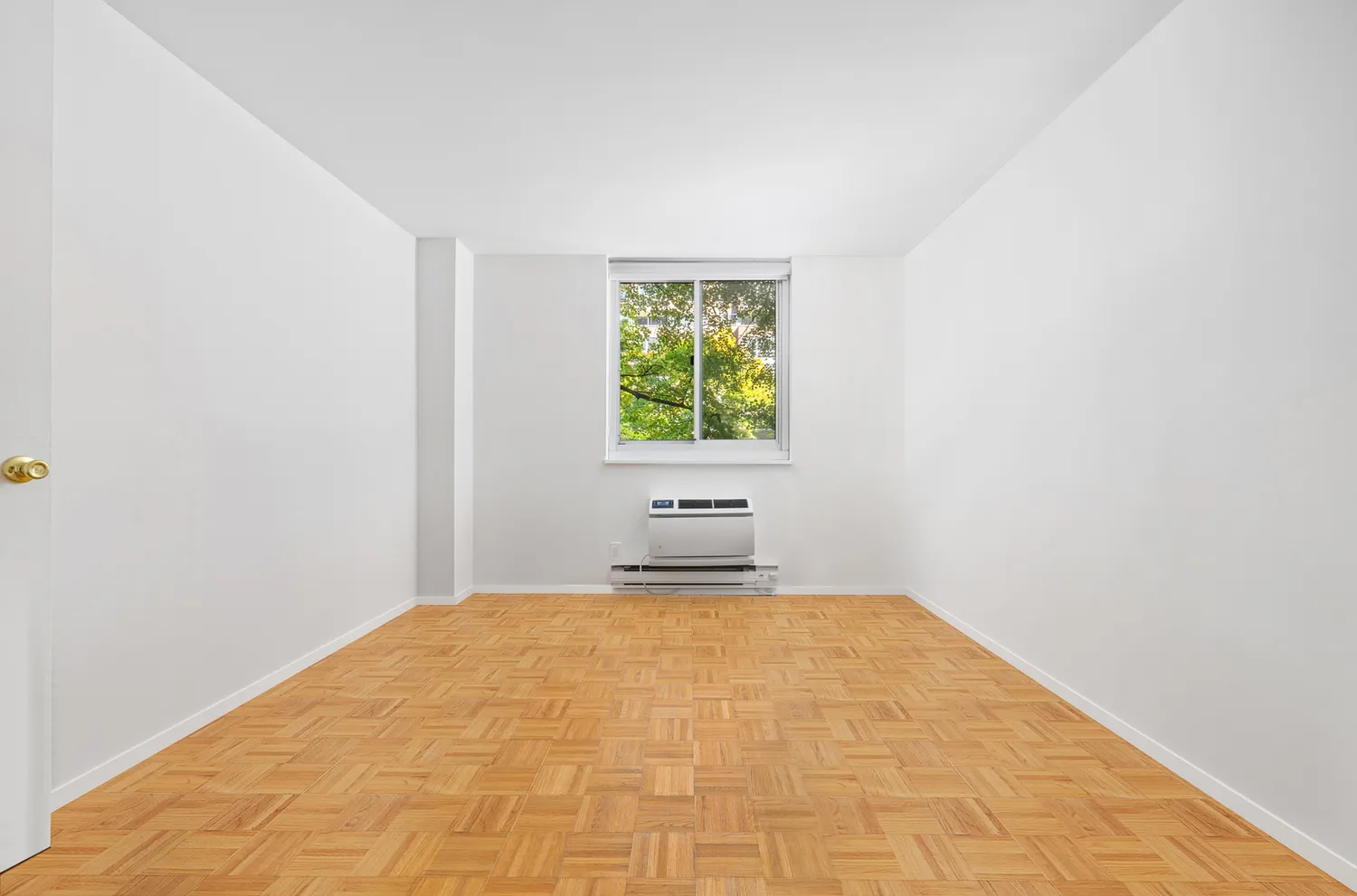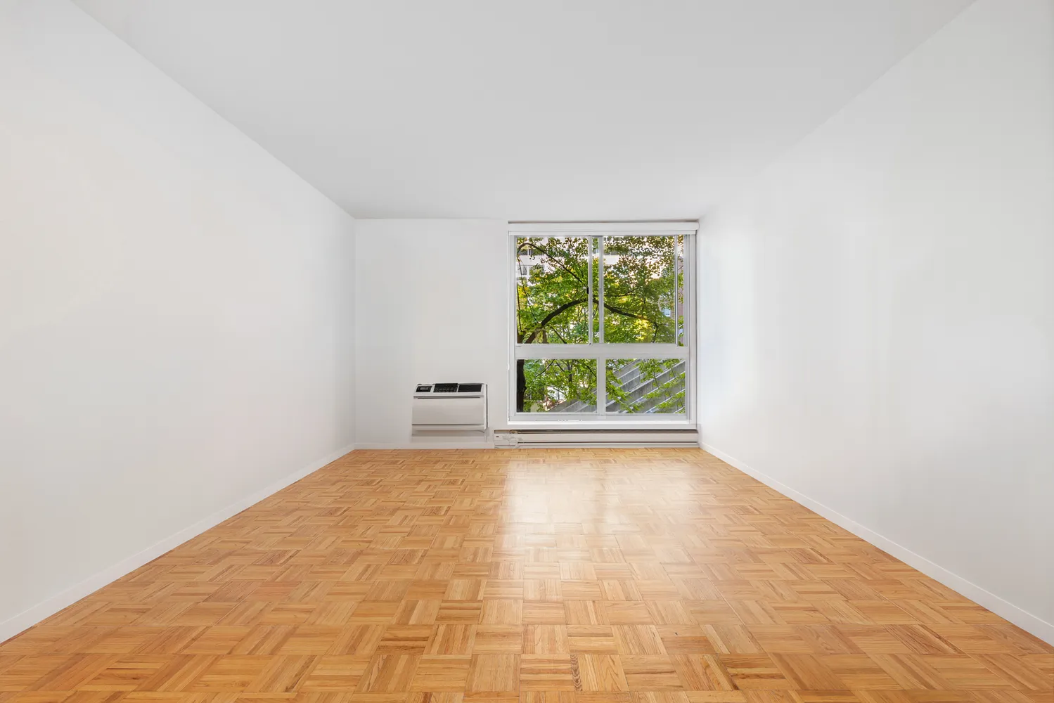 Enjoy stunning park views from the living/dining and large bedroom. The apartment features a pass-through kitchen with full-size appliances and ample closet space throughout. The home includes a full bathroom and year-round comfort with through-the-window air-conditioning.