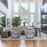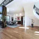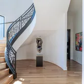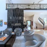 The dramatic entry sets the tone with soaring ceilings, walls of glass, and a sculptural staircase that makes an unforgettable first impression. Light pours into expansive living areas that flow seamlessly from one space to the next, anchored by a striking floor-to-ceiling fireplace.