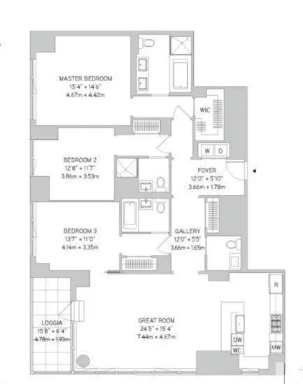 The master bedroom features a grand walk-in close and an en suite Teak-wrapped master bath which features Zuma deep soaking tub, separate glass shower, Bianco Dolomite marble double sink vanities and floors. The second bedroom also has an ensuite secondary bath crafted with brushed nickel Waterworks fitting, luxurious custom crackle porcelain and glass tile and ample closet space. The third bedroom is equipped with an en suite bath and direct entry into the living room. This space can easily be transformed into a home office. The condo also includes a washer/dryer in unit.