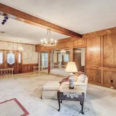 areas, one with wood paneling, wainscoting, built-in cabinets and shelves, a brick wood burning fireplace, and views to the back patio and