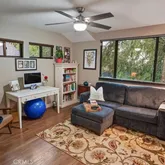 The standout feature is the California Room—a partially enclosed, fully functional outdoor living space with a large ceiling fan and dual Sunpak heaters, creating a seamless indoor-outdoor experience. Additional highlights include custom bedroom closets, remodeled bathrooms, and custom redwood garage doors opening to a sound-treated studio with loft storage.