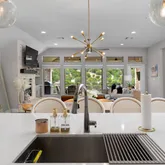 The kitchen is a chef’s paradise, with ample space for both cooking and entertaining. A second wall of counters and storage adds extra functionality, while the stainless steel appliances and a 36” 5-burner gas cooktop make cooking a breeze. A custom-built bar and wine fridge complete the space, while the warm golden accents in the hardware and modern chandelier elevate the entire look. The spacious kitchen island not only serves as a striking centerpiece but also offers plenty of storage.