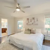 Upstairs, the primary suite features a walk-in closet and an en-suite bath with a double vanity and walk-in shower. A guest bedroom with private half bath, a bedroom with en-suite full bath, and two additional bedrooms share a remodeled hall bath, offering space and comfort for everyone.