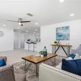 Welcome to this beautifully fully renovated home, where modern design meets comfort and functionality. From the moment you arrive, the fiberglass front entry door with frosted glass sets the tone for the sleek, contemporary finishes found throughout the property. Inside, the home is filled with natural light thanks to floor-to-ceiling windows and brand-new energy-efficient windows, complemented by recessed lighting in the living room, hallways, and kitchen. Elegant wood-plank ceramic tile flooring flows seamlessly throughout the entire home. The chef’s kitchen is a true showstopper, featuring shaker wood cabinets with soft-close doors, granite countertops, and a Karran kitchen sink. The spacious layout offers extra counter space and additional cabinetry, perfect for entertaining. The kitchen is fully equipped with Samsung stainless steel appliances, including a cooktop, oven, microwave drawer, dishwasher, disposal, and refrigerator. French doors lead to a covered, wood-screened patio with serene views of mature landscaping—ideal for indoor-outdoor living. The primary suite boasts a spa-like bathroom with dual his-and-her sinks, a LED Bluetooth defog mirror, pebble stone shower flooring, and a luxurious rainfall shower. New patio doors provide direct access to the backyard, enhancing privacy and relaxation. Additional upgrades include brand-new plumbing and electrical, an updated breaker box, a tankless water heater, a dedicated laundry room, and a Bluetooth-controlled ceiling fan in the living room. This home has been thoughtfully updated from top to bottom—offering modern efficiency, stylish finishes, and exceptional comfort. A must-see property that is truly move-in ready.