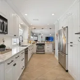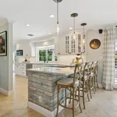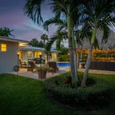 layout, abundant natural light, beautiful plantation shutters, a reclaimed accent wall, and a spacious living room. Impressively reimagined to reflect modern culinary desires, the open concept gourmet kitchen features stainless-steel appliances, gleaming countertops, white cabinets, a French door refrigerator, a dishwasher, a glass top stove, a built-in microwave, a breakfast bar, and an adjoining dining area. Marvelously fashioned with thoughtful touches, the oversized primary bedroom delights with a split-unit A/C, and a remodeled en suite boasting glamorous light fixtures, a glass enclosed shower, custom tilework,. Each additional bedroom comfortably accommodates guests, while the renovated bathrooms stun with exquisite Elfa custom closets. Unparalleled entertaining possibilities are discovered in the fully enclosed backyard, which includes a remodeled deck/heated and chilled swimming pool, a fun tiki hut with bar, and verdant professional landscaping. Grill delicious goodies and laugh with friends, while other guests relish in the upscale amenities of your Caribbean-inspired backyard. Other features: 2-car garage, courtyard, sizeable laundry area w/built-ins, new electrical panel (up-to-code), updated PVC sprinkler system, hurricane windows/doors, ), new A/C ductwork. Get all the advantages and start living the good life today. Call now to schedule a private tour!
