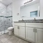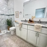 double sink vanity and a frameless shower glass door. The home includes 2” faux blinds