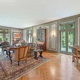 The dining area is adjacent to the kitchen and is highlighted by classic herringbone hardwood floors, floor-to-ceiling windows, decorative moldings throughout, and two built-in china cabinets to store your most treasured pieces of china, glassware, and serving pieces.