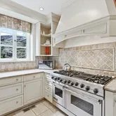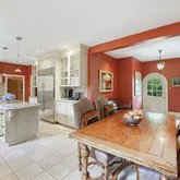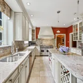 The Gourmet chef's kitchen with large island features beautiful marble countertops, Subzero 48” refrigerator and freezer, Viking 48” oven and range, two sinks, a stunning terracotta floors with radiant heated floors and an expansive breakfast area.