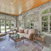 The Great Room offers gleaming, herringbone hardwood floors, beautiful mouldings, an oversized gas marble fireplace, high ceilings, and three sets of french doors. The french doors lead out onto the patio and also into the sunroom, creating a beautifully seamless floor plan. The elegant sunroom, washed in sunlight, is a four-season room featuring flagstone flooring, recessed lighting, and beautiful ceilings. The true beauty of this room is the custom arched windows that look out onto the stunning property and allow the light to encapsulate the entire space.