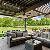 The exterior grounds are nothing short of extraordinary, featuring a sprawling lawn enhanced by a large terrace ideal for entertaining. This outdoor oasis includes a grill, a cozy fireplace, and a covered all-season terrace equipped with ceiling fans for warm days and heat lamps for cooler evenings, perfect for enjoying outdoor gatherings throughout the year. A hot tub and fire pit further enrich the outdoor experience, creating a unique, private sanctuary for year-round enjoyment.