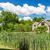 The exterior showcases hand-split cedar shingles and fieldstone construction, marked by meticulous craftsmanship, including thoughtfully "pinched" mortaring that enhances its rustic appeal. Slat-styled windows illuminate the three-car garage while echoing the classic aesthetics of traditional barns.
