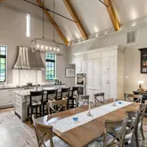 Upon entering, one is welcomed into an expansive open-concept space that seamlessly combines the living, dining, and kitchen areas. Boasting soaring ceilings that exceed 25 feet, the interior is anchored by elegant steel turnbuckles that grace the peaked roof. A sophisticated color palette unifies the various spaces, while a gas-burning fireplace serves as a focal point within the seating area. The dining space is beautifully defined by refined lighting, complemented by a well-appointed bar featuring custom cabinetry for wine and stemware, alongside a dedicated wine chiller.