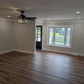 vinyl plank flooring, entirely freshly painted interior. New electrical service and wiring and ceiling fans and lighting. Custom 2 color kitchen cabinets w/designer backsplash, quartz countertops, 5ft breakfast bar island, Samsung stainless