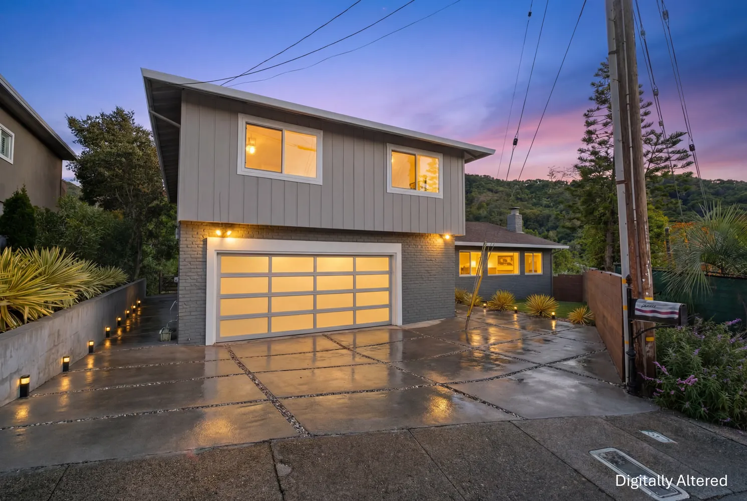 Outdoor living is equally inviting, with a generous deck overlooking the surrounding hills—an ideal spot to unwind and enjoy the natural beauty that defines this part of San Rafael. The exterior has been thoughtfully improved with updated landscaping, new retaining walls, and a new modern concrete driveway with river‑rock accents, along with a new aluminum garage door with light panes that adds architectural polish.